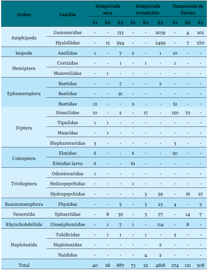 Se colectaron un total de 6781 individuos de macroinvertebrados acuáticos pertenecientes a 3 phylum, 5 clases, 11 órdenes y 21 familias. La familia Hyalellidae mostró la mayor abundancia con 3385 individuos (49,9 %), seguida por Gammaridae con 2377 individuos (35,1%) (tabla 1).