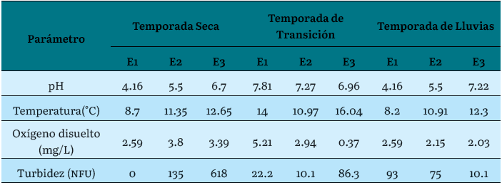 El comportamiento del pH para la temporada seca y de lluvias mostró una tendencia a tener valores más bajos en la estación con mayor elevación con respecto a las estaciones con menor elevación, mostrando un rango entre 4,16 y 7,22; para la temporada de transición mostraron valores similares en las distintas estaciones, con valores entre 6,96 y 7,81. Esto puede ser explicado por el hecho de que el río Teusacá nace en zona de páramo, donde los suelos son ácidos, sin embargo, a medida que el río desciende altitudinalmente el pH se va neutralizando (tabla 2).
