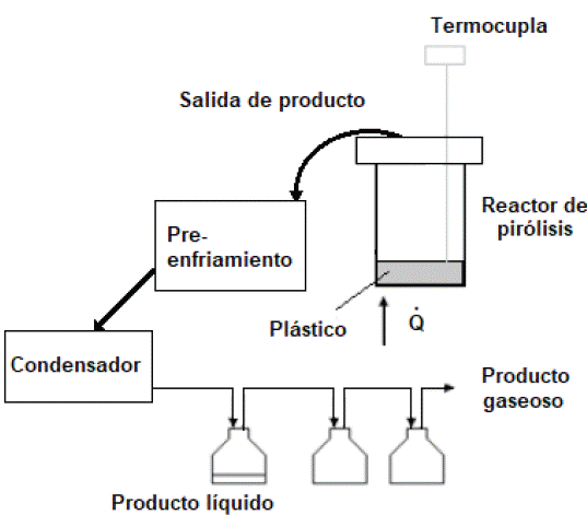 La pirólisis es una técnica de reciclaje en la que se da la descomposición térmica de los polímeros en ausencia de oxígeno o con una cantidad limitada del mismo, normalmente a temperaturas entre 300 y 900°C [4H7]. Dependiendo de la temperatura a la cual se dé la pirólisis y otras condiciones de operación del proceso (como presión, flujos o carga de materia prima, velocidad de calentamiento, tiempo de exposición, etc.), pueden obtenerse mezclas de productos sólidos, líquidos y/o gaseosos en diferente proporción y con diferente composición.