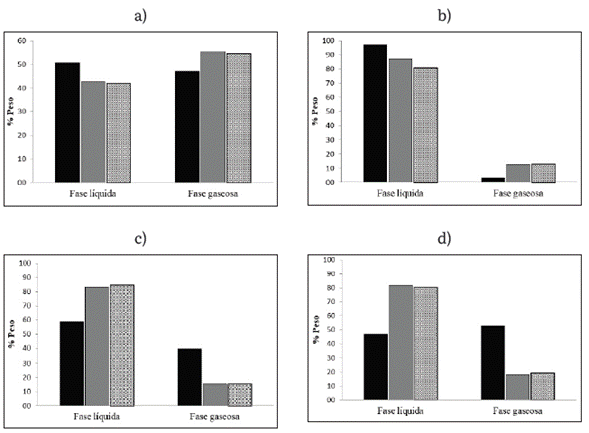 En la figura 3 se muestran comparativamente los resultados de las simulaciones en cuanto al rendimiento hacia productos líquidos y gaseosos (% peso) utilizando el modelo termodinámico, el modelo cinético y datos reportados en la literatura (obtenidos bajo las mismas condiciones simuladas) para las diferentes materias primas (PP, PS, HDPE y LDPE). En todos los casos la fracción de productos sólidos resultó ≤ 2 %, por lo tanto no se incluyen en el gráfico para no afectar la escala comparativa en la capacidad predictiva de los modelos con relación a la obtención de las fases líquida y gaseosa. En la figura 3 se observa que el modelo cinético resulta más acertado que el modelo termodinámico para predecir la formación de combustibles líquidos y productos gaseosos (por comparación con datos de la literatura) independiente de la materia prima utilizada. El porcentaje de error entre los datos predichos por el modelo cinético y los datos de la literatura son ≤ 2 %, excepto para la formación de productos líquidos utilizando PS como materia prima (figura 3b), donde el error es cercano al 8 %.