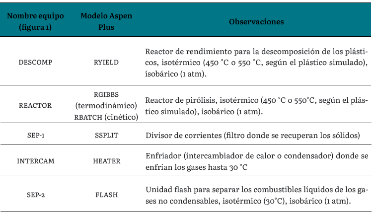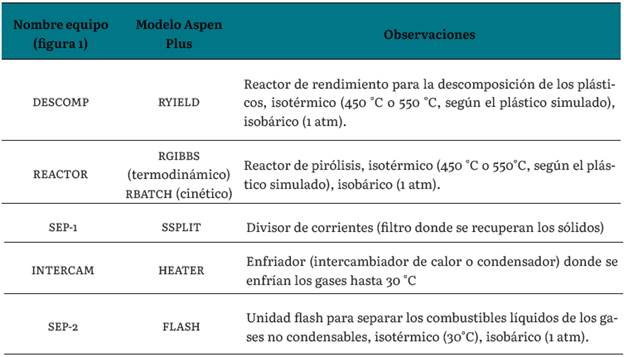 La implementación de los modelos en Aspen Plus (versión 8.7) se realizó de acuerdo con recomendaciones de la literatura para simular transformaciones termoquímicas; por ello se utilizaron dos aproximaciones diferentes: modelos basados en la termodinámica (utilizando reactores donde se minimiza la energía libre de Gibbs "RGIBBS") [14], [21] y modelos basados en la cinética (utilizando reactores por lotes "RBATCH") [2], [11], [15]. Para ambas aproximaciones, los plásticos cuya pirólisis se simuló en el proceso (PET, PP, PS, HDPE y LDPE) se ingresaron mediante la corriente ALIMENTO (figura 1) como sólidos no convencionales, caracterizándolos de acuerdo con datos de análisis próximo y último de cada material en base seca y con cenizas [21]. El bloque DESCOMP (figura 1) corresponde a un reactor de rendimiento (R-YIELD) en el cual, con ayuda de subrutinas en FORTRAN [14]-[21], se estimó la composición de cada plástico en elementos convencionales que permitieran posteriormente simular las reacciones (a partir de la termodinámica o la cinética, de acuerdo al modelo utilizado) en el bloque REACTOR (figura 1). En el modelo, los productos de pirólisis provenientes del reactor se dividen en dos corrientes (equipo SEP-1, Figura 1): una corriente de sólidos no convencionales remanentes que de acuerdo con los modelos utilizados se asume que solo contiene cenizas, y otra corriente que luego de enfriarse hasta temperaturas cercanas a la ambiente (30°c) en el equipo INTERCAM (figura 1), se divide en el equipo SEP-2 (figura 1) para obtener los productos gaseosos a través de la corriente PROD-GAS (no condensables) y los combustibles sintéticos a través de la corriente BIO-COMB (figura 1). Los modelos de Aspen plus y las condiciones de operación de cada bloque de la figura 1 se detallan en la tabla 2.