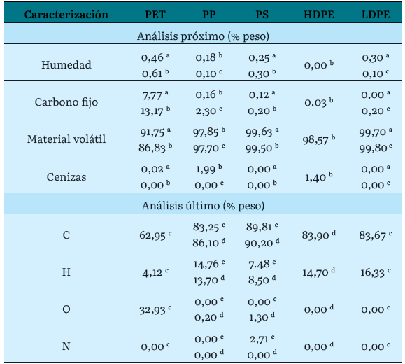 En el caso de los residuos sólidos municipales, los tipos de plásticos más comúnmente encontrados son el polietileno tereftalato (PET), polipropileno (PP), poliestireno (PS), polietileno de alta densidad (HDPE) y polietileno de baja densidad (LDPE), entre otros [9]. En la tabla 1 se presenta una clasificación de estos materiales de acuerdo con su composición según análisis próximo, es decir, su contenido de humedad, carbono fijo, material volátil y cenizas, así como su análisis último o elemental (contenido de carbono, hidrógeno, oxígeno y nitrógeno).