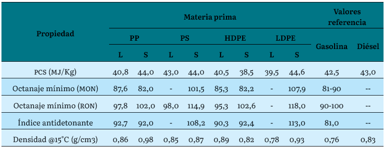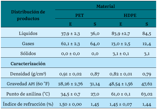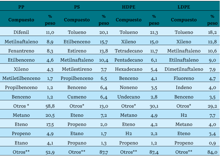 Normalmente los productos sólidos se clasifican como cenizas y corresponden mayoritariamente a materiales inertes que pueden entrar en el proceso de acuerdo con la materia prima utilizada y el carbono formado por las reacciones que se pueden dar durante el proceso. Los productos gaseosos pueden clasificarse como gas de síntesis (syngas) y contienen los gases no condensables, como H2, CH4, C2H6, C2H4, CO, CO2, entre otros. Por último, el producto líquido suele clasificarse como biocombustible (o combustible sintético) y consiste en una mezcla de olefinas, fenoles y compuestos aromáticos caracterizados por la ausencia de oxígenos como sustitutos, tales como benceno, naftaleno, antraceno, tolueno, indeno, entre otros [8]. La composición de cada una de estas corrientes también dependerá de la naturaleza o composición de los plásticos o residuos que se utilizan como materia prima en el proceso.