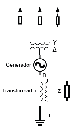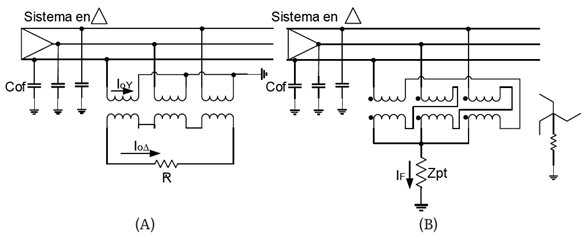 En una falla línea a tierra en los bornes de un generador conectado en Δ, no hay un camino para la circulación de corriente de secuencia cero [6]. Para tener una referencia a tierra y una magnitud de corriente de cortocircuito a tierra suficiente como para ser detectada, se utiliza el método de puesta a tierra mediante transformador conectado en Ynd, como se ilustra en la figura 3A, o zigzag, como se ilustra en la figura 3B.