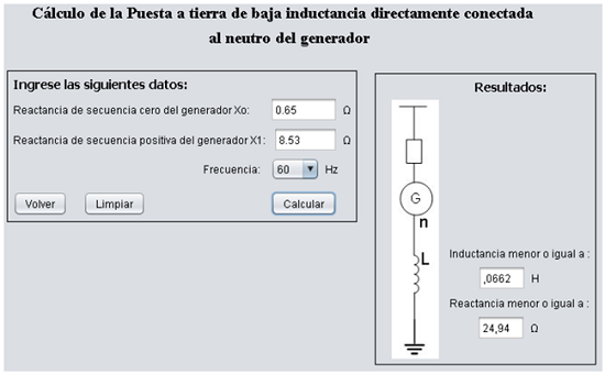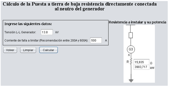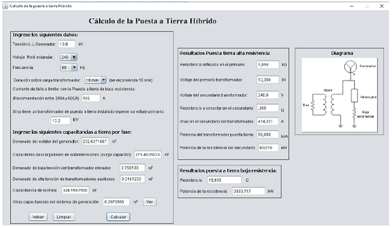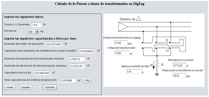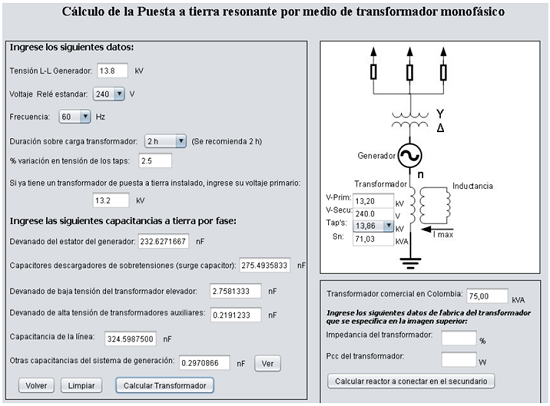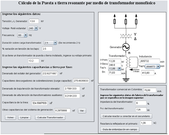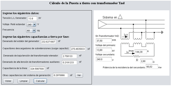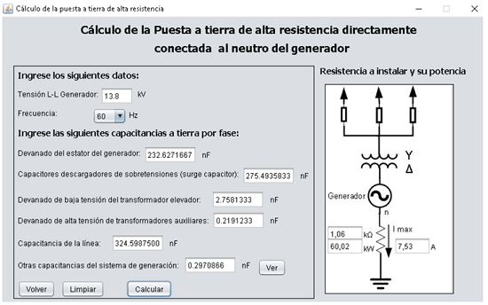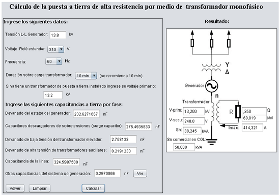 La figura 11 ilustra la interfaz que presenta el software, donde se ingresan los datos del generador y las capacitancias a tierra de la primera unidad de generación de la Central Hidroeléctrica de Calima. Como resultado, se entregan las especificaciones de la PTN de alta resistencia por medio de un transformador monofásico que se debería tener instalado. Es necesario resaltar que: