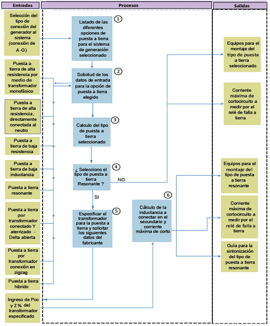 En la figura 5, se presenta la metodología para la selección y especificación de la PTN. En la parte izquierda del diagrama, se ubican los datos de entrada: configuración y datos del sistema de generación. En la parte central, se ilustran los procedimientos requeridos para especificar el tipo de puesta a tierra idóneo para el sistema de gene ración en estudio. Finalmente, en la parte derecha, se presenta como salida los equi pos a instalar para la puesta a tierra seleccionada, incluyendo la máxima magnitud de corriente de cortocircuito que puede circular por el relé de falla a tierra.