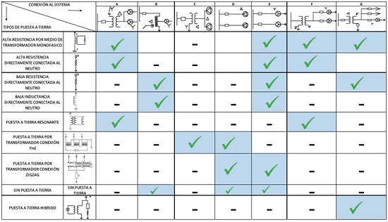 Para lograr la especificación de la PTN, primero, es necesario identificar los tipos de puesta a tierra que son recomendados de acuerdo con las configuraciones de conexión del generador al sistema. La norma IEEE Std C37.101.2006 [2] indica cuáles son los tipos de puesta a tierra aplicados a los sistemas de generación más comunes, los cuales se presentan en la tabla 1.