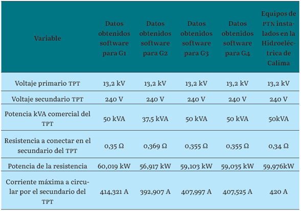 En la tabla 2, se presenta la comparación entre las especificaciones entregadas por el software desarrollado y las existentes en las cuatro unidades de generación de la Central Hidroeléctrica de Calima. Este ejercicio permitió verificar que, en términos prácticos, los generadores de dicha central tienen una correcta selección del transformador de puesta a tierra (TPT) y correcta especificación de la PTN.