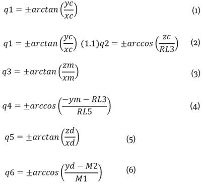 Siendo q1, q2, q3, q4, q5 y q6 las variables articulares para cada una de las articulaciones del robot PA10 como respuesta a la consigna de movimiento ingresada al sistema. Por otro lado, las variables xc, yc, zc, xm, ym y zm representan las posiciones cartesianas del codo (articulación 3) y la muñeca (articulación 4), mientras que las variables xd, yd y zd son las coordenadas correspondientes al valor deseado o ingresado, en este caso por la consigna de movimiento.