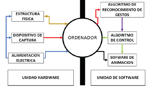 El sistema se compone por dos unidades principales que conforman el funcionamiento del robot (figura 1). La primera de estas unidades, denotada como unidad hardware, se compone por una estructura física o brazo robótico, una fuente de alimentación, un ordenador de control, una seta de emergencia y el dispositivo de captura de movimiento, en este caso el dispositivo comercial Leap Motion. Por otro lado, la segunda unidad (unidad software) se compone del algoritmo de control, el algoritmo de reconocimiento de gestos y el software de animación tridimensional.