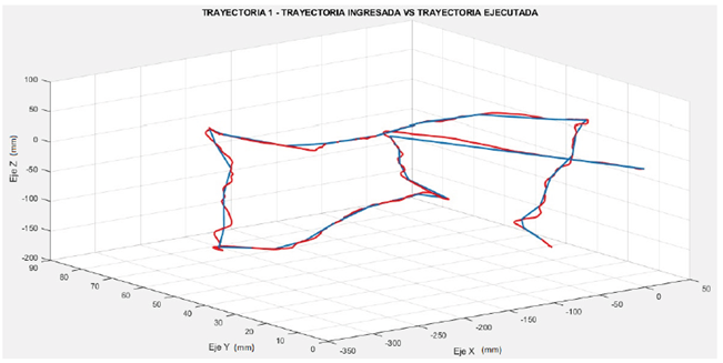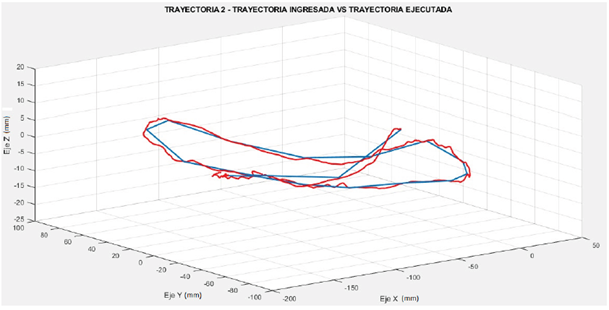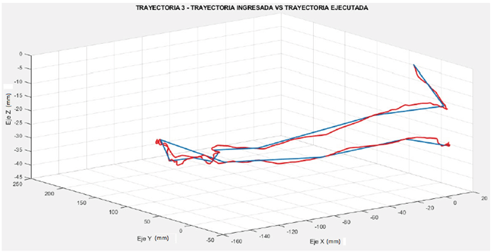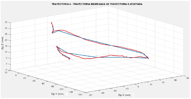 En ninguno de los casos se efectuó un escalamiento entre las consignas ya que la con signa ingresada se encuentra dentro del espacio de trabajo del robot articulado. En caso de que se efectué un movimiento involuntario (p. ej., resbalar, caer, entre otros) dentro del muestreo de la trayectoria ingresada o que esta se encuentre fuera del espacio de trabajo, el algoritmo de control no las toma en cuenta y se detiene al llegar a su límite de operación; adicional a ello el sistema robótico tiene una seta de emergencia que al accionarla activa los frenos de cada uno de sus motores en caso de que se requiera.