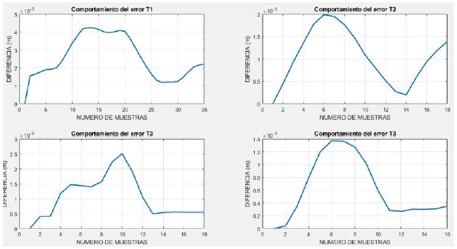 El error cartesiano obtenido para cada una de las cuatro trayectorias se muestra en la figura 14. Se puede notar que la diferencia entre la señal deseada y la señal obtenida no sobrepasa los 5 × 10-3 m en la ejecución de la trayectoria 1 (figura 10), por ejemplo, y que el error promedio para las cuatro pruebas realizadas es de 1,3 × 10-3 m (poco más de 1 mm).