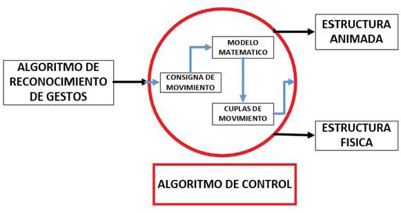 Compuesto por la consigna de movimiento, modelos matemáticos de control y las cuplas de movimiento para cada una de las articulaciones del brazo articulado. En la figura 4, se muestra la representación del funcionamiento interno del algoritmo de movimiento (circunferencia roja). Inicialmente, a este se le ingresa la consigna de movimiento o de trabajo entregada por el algoritmo de reconocimiento de gestos expuesto y, luego, esta consigna se ingresa al modelo matemático el cual entrega las cuplas de movimiento para el funcionamiento tanto del robot animado en software como de la estructura física real.