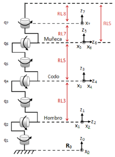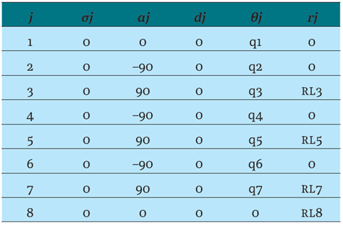 Siguiendo el análisis entre ejes y articulaciones de Dombre y Khalil descrito en [17], se obtiene la tabla de parámetros geométricos (tabla 1). Cabe aclarar que dentro de la tabla de parámetros en mención se cuenta con una octava articulación debido a la distancia RL8 vista en la figura anterior (figura 5), la cual existe entre el eje de la articulación 7 y la terminación del órgano terminal.