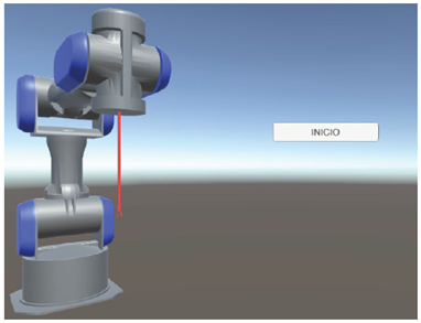 Posteriormente, esta consigna se ingresa al algoritmo de control, el cual internamente se encarga de entregar como respuesta las cuplas para cada uno de los motores de las articulaciones para realizar el movimiento deseado. Esta actividad se replica de principio a fin hasta que el usuario presione la seta de emergencia o se oprima el botón de fin dentro de la interfaz de usuario construida. La estructura física y la representación virtual inicialmente se encuentran en la posición mostrada en la figura 8.
