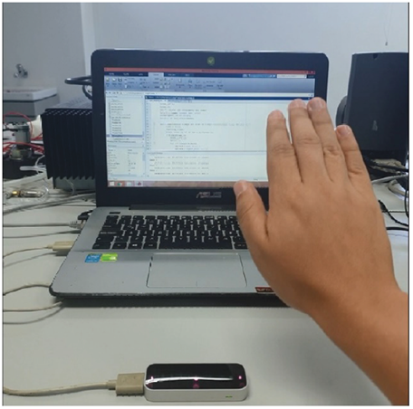 Inicialmente, el usuario coloca en una mesa plana el dispositivo de captura de gestos Leap Motion y, luego, realiza la señal de movimiento con su mano derecha frente al dispositivo mencionado, y genera la consigna de trabajo, como se muestra en la figura 7.