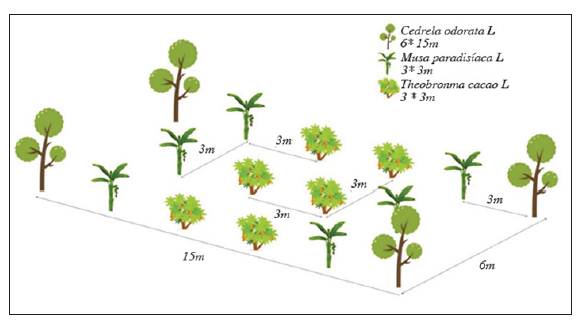 De acuerdo con la investigación y por consenso con la comunidad, se planteó el siguiente diseño: "Asociación agroforestal C. odorata L., T. cacao L. y M. paradisiaca L.". El diseño se planteó con tres especies: T. cacao como cultivo principal a una distancia de siembra 3 * 3m; M. paradisiaca como cultivo intercalado que proveerá sombra transitoria a una distancia de siembra 3 * 9 m, y C. odorata, especie con el mayor CI y que se empleará como sombra permanente, sembrada a 6 * 15 m (figura 1).