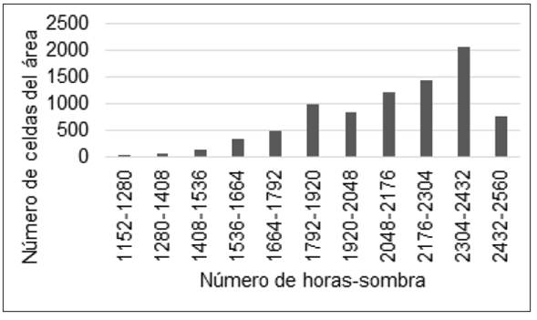 De acuerdo con las horas de sombra en el área de muestreo, 2.055 celdas localizas a los bordes presentan entre 1.152 y 1.920 horas de sombra durante el año, con un promedio diario de 3,2 y 5,3 horas, con porcentajes de sombra entre el 24,3 y el 40,5 %. Y 6.361 celdas ubicadas hacia el centro presentan entre 1.920 y 2.560 horas de sombra durante el año, con un promedio diario de 5,3 y 7 horas, con porcentajes de sombra entre el 40,5 y el 54 % (figura 2).