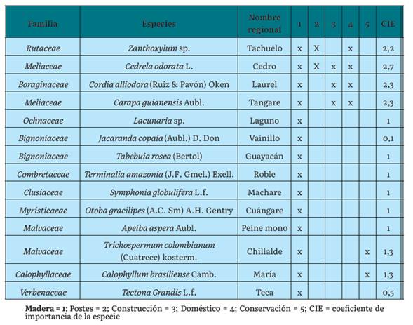 Algunas de las especies empleadas por los agricultores reportan cuatro y tres usos, entre las que se encuentran C. odorata, Zanthoxylum sp., C. alliodoray C. guianensis. Y especies como T. grandis, Lacunariasp., J. copaia, T. rosea, T. amazonia, S. globulifera, O. gracilipesy A. aspera reportan en las fincas solo un uso (tabla 1).