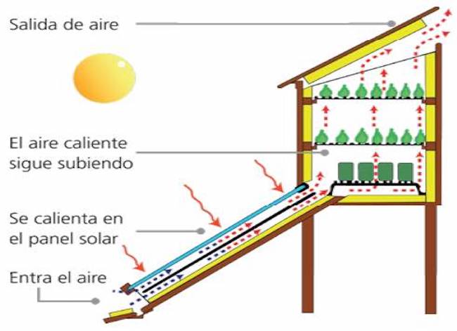 En los deshidratadores solares indirectos (figuras 2, 3) el aire se calienta en el colector, el mismo que no se encuentra en contacto directo con el producto [13]. Al no estar en contacto directo se producen pérdidas de calor por convección, lo cual reduce el tiempo de calentamiento del aire y, a su vez, conlleva al aumento en el tiempo de deshidratación del producto al reducir la eficiencia del equipo [14].