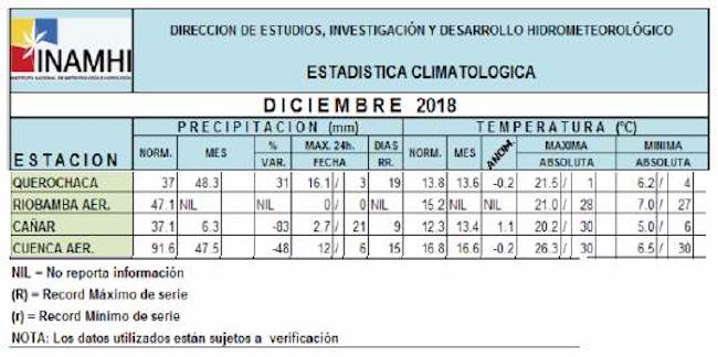 Al usar como referencia los meses de noviembre y diciembre, y tener en cuenta las condiciones climáticas de Riobamba, en la Facultad de Mecánica de la Escuela Superior Politécnica del Chimborazo (ESPOCH), se estimaron datos base para la temperatura promedio de la simulación mediante un termómetro higrómetro digital (figura 5). Los valores de temperatura mínima y máxima adquiridos fueron de 8,5 °C y 24 °C, respectivamente. Estos datos se contrastaron, a fin de corroborar su veracidad, con información producida por el Instituto Nacional de Meteorología e Hidrología del Ecuador (INAMHI), organismo regulador y de control de las condiciones meteorológicas del Ecuador, tal como se presenta en la figura 6.