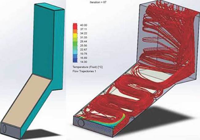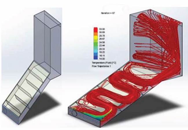 Ahora bien, si se aplica la simulación en el deshidratador solar indirecto con la fibra natural de totora como aislante térmico, la temperatura asciende de 33 °C a 40 °C, tal como se observa en la figura 9. De esta manera, es posible corroborar los criterios por los que un aislante térmico natural puede aumentar la eficiencia de un equipo para deshidratar frutos con energía solar.