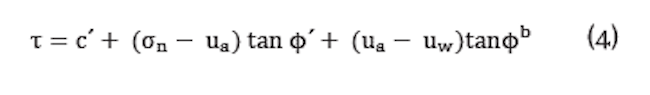 Donde σ es la tensión normal en la falla, (ua - uw ) es la succión, c' es la cohesión efectiva, d)'es el ángulo de fricción interna efectivo, y Фb es el ángulo de succión del suelo.