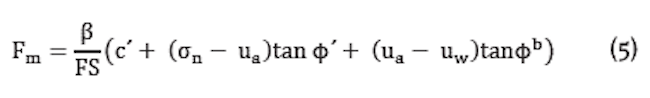 SLOPE/W solo considera las condiciones de resistencia al corte no saturadas cuando las presiones de poros son negativas. En estas condiciones, el ángulo de succión (Φb) se utiliza para calcular la fuerza de fuerza de corte movilizada en la base de cada dovela. Cuando el ángulo de succión (Φb) se deja en blanco o se establece en 0° no habrá un aumento en la resistencia al corte debido a la succión. Cuando el ángulo de succión (Φb) se iguala al ángulo de fricción interna efectivo (qV) se indica que las presiones de poros negativas serán tan efectivas para aumentar la resistencia al corte del suelo como las presiones de poros positivas para reducirla. Por lo general, el ángulo de succión (Φb) es mayor que cero, pero menor que el ángulo de fricción interna efectivo (Φ). El inconveniente del uso del ángulo de succión (Φb) como una constante es que se supone que la envolvente de falla extendida de Mohr-Coulomb aumenta linealmente con la succión del suelo, lo que tiende a sobrestimar la resistencia al corte del suelo parcialmente saturado, particularmente cuando la succión del suelo es muy alta. Como mejor alternativa al uso del ángulo de succión (Φb) SLOPE/W implementó la ecuación 6 propuesta por [12].