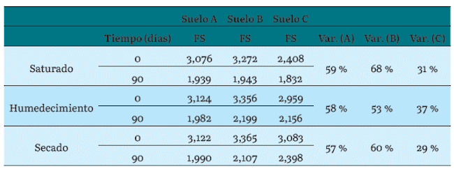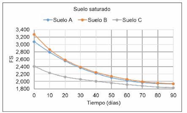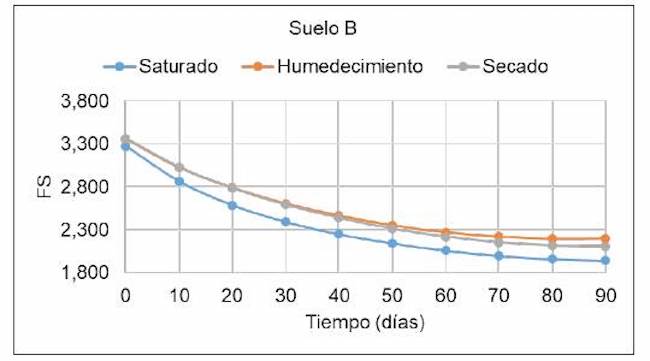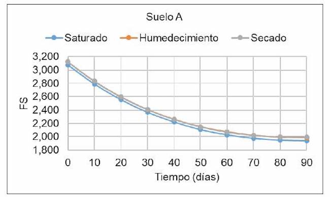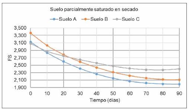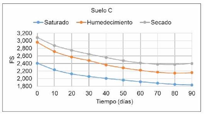 En las figuras 13, 14 y 15 puede apreciarse que, si bien los tres suelos tienen la misma clasificación por el Sistema Unificado de Clasificación de Suelos (SUCS), presentan comportamientos diversos ante el fenómeno analizado. El suelo A presenta variaciones del orden del 2 % entre el estado saturado y el parcialmente saturado, esto al considerar ambas curvas, ya que el comportamiento en secado y en humedecimiento prácticamente no varía. El suelo B muestra variaciones en humedecimiento entre el 3 % y el 13 % al inicio y al final del desembalse rápido; en secado las variaciones oscilan entre el 3 % y el 8 %. Estos valores se obtienen respecto al suelo en estado saturado. En el suelo C las variaciones se incrementan, y oscilan entre el 18 % y el 23 % en humedecimiento, y entre el 26 % y el 31 % en secado respecto al suelo en estado saturado. En ninguno de los casos se evidencian factores de seguridad inferiores a 1, por lo que, para la geometría planteada y los suelos considerados, el talud aguas arriba mantiene aún las condiciones de seguridad y estabilidad establecidas inicialmente.
