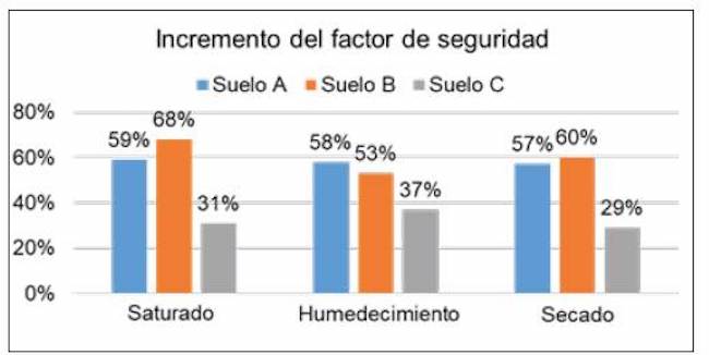 Puede observarse que para todos los casos el incremento es superior al 5 %, lo cual representa que el valor es significativo desde el punto de vista ingenieril. Para la rama en secado el incremento es inferior al obtenido en estado saturado y con la rama en humedecimiento en los tres suelos considerados en la investigación.