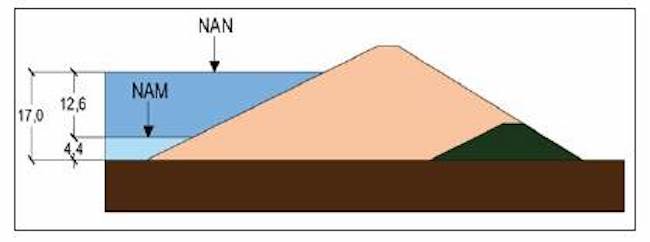 A fin de considerar el efecto del desembalse rápido de la presa, a partir del flujo transitorio, producto de un periodo de sequía prolongada, se supone que el nivel de las aguas descenderán a razón de 15cm/ día. Si la presa tiene inicialmente el nivel de aguas normales (NAN) con una altura de diecisiete metros, para reducir su nivel hasta el de aguas muertas (NAM) a 4,4 metros, se necesitarán cerca de noventa días. En la figura 6 se muestra la variación en los niveles de agua considerados.