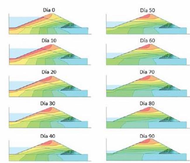 Una vez realizada la modelación, se obtienen los diferentes niveles de agua durante los noventa días de duración del desembalse a partir de considerar el proceso de filtración transitoria en el SEEP/W; adicionalmente, se muestra la modificación de la superficie de falla (estas etapas se muestran en la figura 7 y 8).