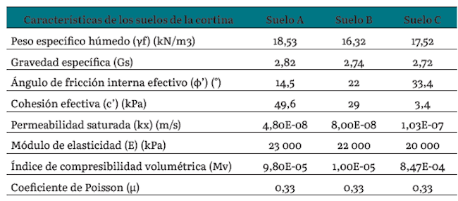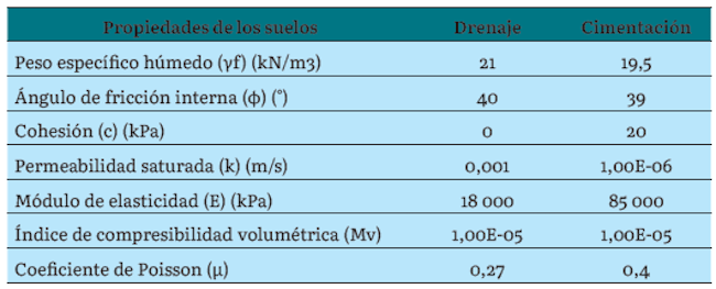 Los suelos para la cimentación y el drenaje se muestran la tabla 3. En la cimentación se considera una arena arcillosa y en el drenaje se considera una grava de alta permeabilidad, según lo planteado por [14], [15].