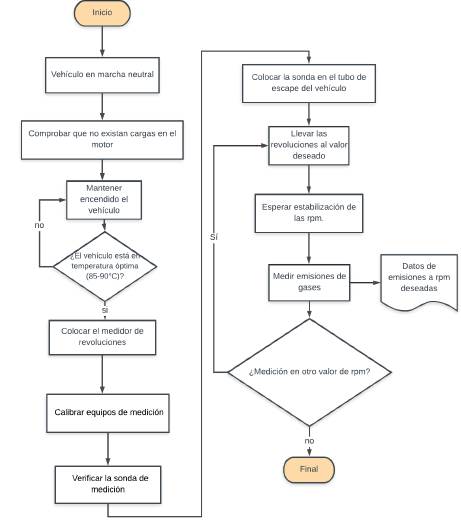 Antes de cada prueba se verifica que el motor se encuentre a temperatura normal de funcionamiento (80 °C) y la transmisión en posición neutral. Se realizaron cinco mediciones para cada cota de altura sobre el nivel del mar y revoluciones del motor, lo que dio lugar a un total de sesenta mediciones de gases de escape que muestran resultados de monóxido de carbono CO (% vol.), dióxido de carbono CO2 (% vol.), hidrocarburos no combustionados HC (ppm) y factor lambda. Se consideró realizar cinco mediciones para disminuir el margen de error o discrepancia de datos que pudiera existir debido a factores ajenos a la metodología aplicada. El protocolo de pruebas (figura 1) utilizado para todos los ensayos fue el siguiente: