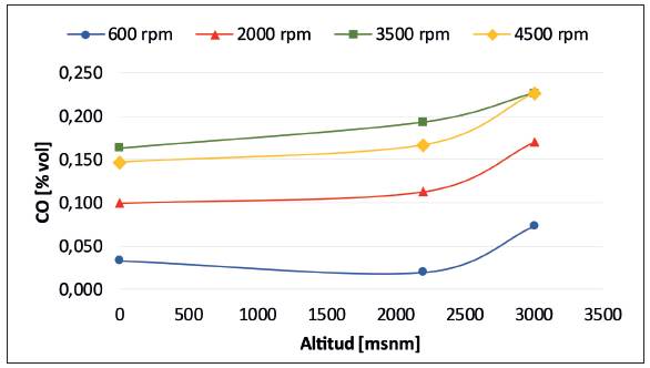 Si se considera el rango de variación de emisiones de CO, se observa que hay un mayor cambio en los resultados bajo efecto de las revoluciones del motor con relación a los datos obtenidos por incidencia de las alturas.