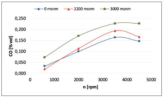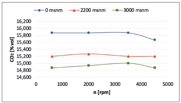 En la figura 3 se observa el aumento de las emisiones de CO a medida que se incrementan las revoluciones del motor. Es importante destacar que, sobre las 3500 rpm, se aprecia el descenso de emisiones de CO debido al funcionamiento del sistema de control de emisiones del vehículo (sistema EGR, EVAP, PCV) y el efecto del funcionamiento del sistema CVVT.