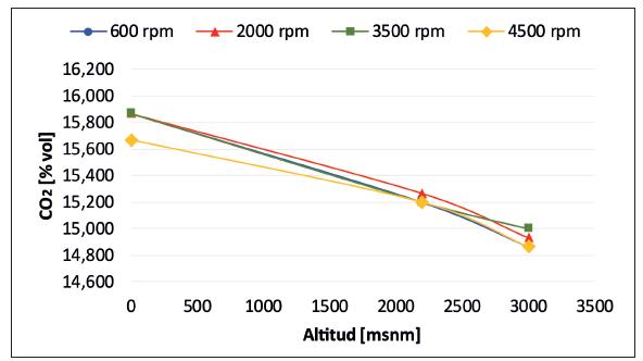 En la figura 4 se aprecia que el factor más influyente en la emisión de CO2 es la presión atmosférica a diferentes alturas. A medida que la altitud incrementa, las emisiones de CO2 disminuyen. Se puede apreciar que, a 0 msnm, las emisiones de CO2 son mayores debido a la alta concentración de oxígeno en el ambiente, lo cual conlleva a una mayor eficiencia volumétrica [7] y, en consecuencia, a un mejor proceso de combustión en el interior del motor.