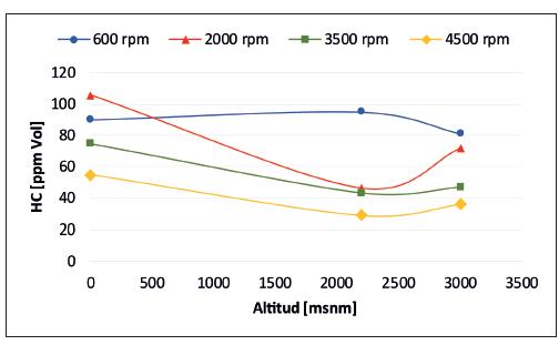 En cuanto a los hidrocarburos no combustionados, el régimen de giro del motor influye de manera directa al disminuir el nivel de emisiones a medida que se incrementan las revoluciones del motor. Sin embargo, el efecto de la presión atmosférica sobre la emanación de HC no muestra una tendencia definida; para esto se requieren estudios adicionales que consideren otros factores, como, por ejemplo, las condiciones meteorológicas y el sistema electrónico de control de emisiones (OBD II) que intervienen en el proceso de combustión del MCI.