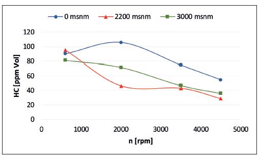 Como se observa en la figura 7, las emisiones de HC disminuyen cuantiosamente al incrementar la velocidad de giro del motor, lo cual corrobora los resultados de estudios previos [11].
