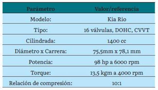 Se utilizó un vehículo marca Kia modelo Rio, fabricado en el 2017, con un motor de cuatro cilindros en línea ciclo Otto. Las características del motor se describen en la tabla 1.