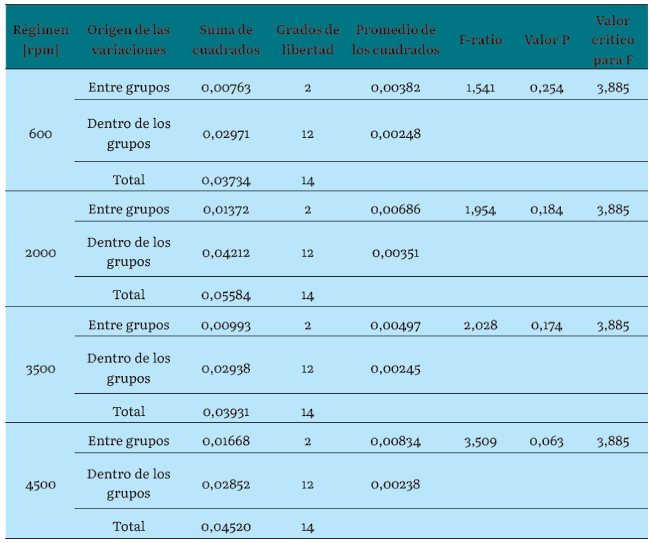En la tabla 3 se observan los resultados estadísticos con respecto al régimen de giro del motor. Se analiza la importancia de las revoluciones por minuto en la generación de monóxido de carbono.