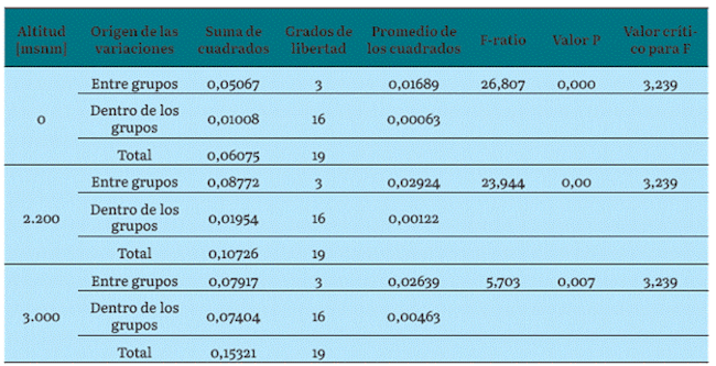 El análisis Anova muestra que el valor P es mayor que 0,05. Esto determina que no existe una diferencia estadísticamente significativa entre las medias de las emisiones de CO en las tres altitudes analizadas con un nivel del 95 % de confianza.