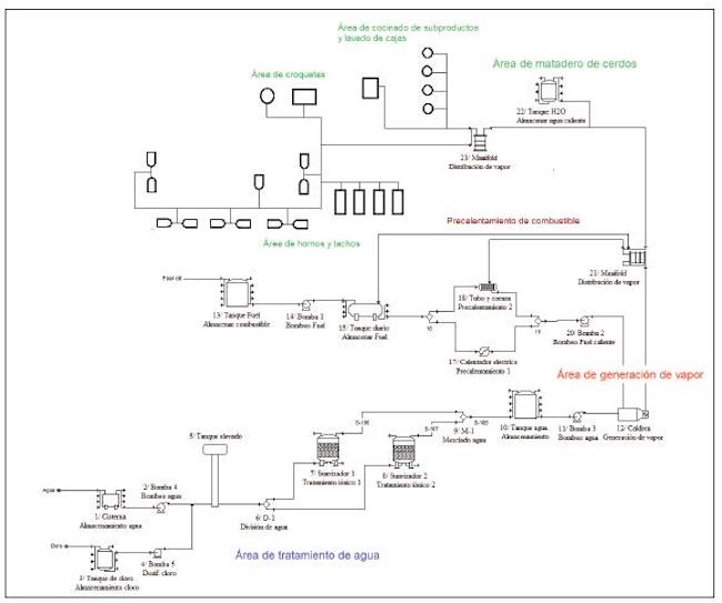 El agua cruda se envía hacia la cisterna desde los pozos de extracción. Mediante un sistema de bombeo se envía hasta el tanque elevado y se le inyecta cloro en la línea de entrada al tanque como primer tratamiento. Luego, a consecuencia de la gravedad, se distribuye el agua clorada hacia todos los puntos de la industria que la consumen. Por su parte, al agua que se va a utilizar en la caldera se le realiza un adecuado tratamiento de suavización con resinas intercambiadoras catiónicas. Una vez suavizada, esta se envía hacia el tanque de almacenamiento de la caldera, a fin de estar en capacidad de bombearla hacia el interior de este equipo. Por otra parte, el combustible se recibe en un tanque de almacenamiento de 108 641 L, y de ahí se envía hacia el tanque diario de la caldera (tanque de trabajo) mediante una bomba de combustible de primer impulso. A continuación, con una bomba de segundo impulso se hace pasar el combustible a un precalentamiento eléctrico, en el que se calienta mediante una resistencia hasta lograr una temperatura de aproximadamente 90 °C, para, finalmente, dirigirse hacia el quemador de la caldera. Después de que el generador ha producido vapor, el calentamiento eléctrico se apaga y se pone en funcionamiento otro precalentador de combustible que utiliza vapor de agua como agente calefactor, con lo que se cumple la misma función del calentador eléctrico (llevarlo a una temperatura de 90 °C). Este calentador recibe el vapor de agua directamente del primer distribuidor de vapor (Manifold), el cual recibe el vapor directo de salida de la caldera. De este primer Manifold sale una tubería que se dirige hacia el tanque de almacenamiento diario de combustible, de modo que sirve como primer precalentamiento con vapor de agua a través del empleo de un intercambiador de calor ubicado en el interior de dicho tanque. Del primer Manifold que se encuentra dentro de la sala de caldera sale una línea de vapor que se dirige hacia un segundo Manifold, que es el encargado de distribuir el vapor de agua hacia las demás áreas consumidoras de vapor de la fábrica, las cuales son (véase la figura 1):