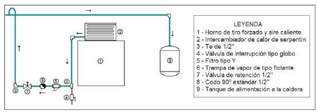 El estudio de este diseño se realizó en el área de cocción, específicamente en el horno argentino con aire caliente. El condensado que se recupera realiza varios recorridos (especificados en el diagrama de flujo de la figura 2), de manera que se envía de forma directa al tanque de alimentación del generador de vapor, logrando el aumento de la temperatura del agua.