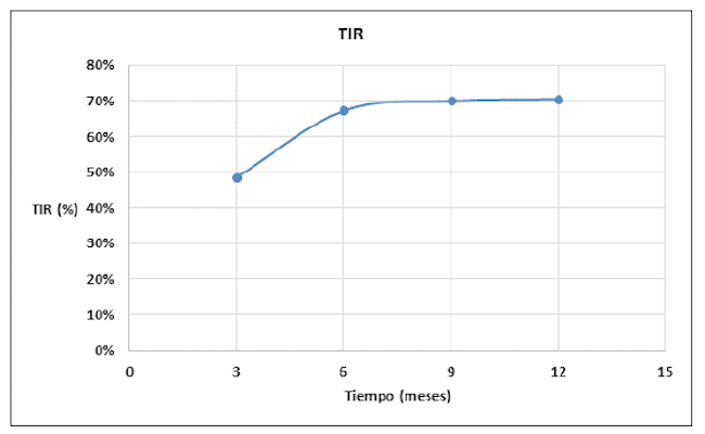 Se obtuvo un valor de la TIR igual al 71 %, superior a la tasa de aplicación empleada en los flujos de caja actualizados. Esto indica aceptar la ejecución del proyecto, pues a mayor TIR, mayor rentabilidad.