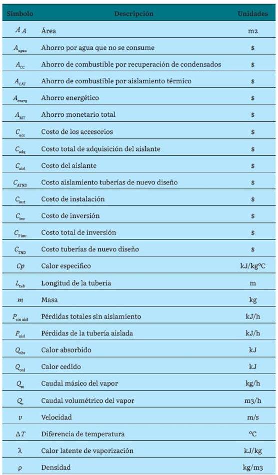 De esta manera, el presente trabajo tiene como objetivo evaluar, desde el punto de vista energético, el sistema de generación, distribución y consumo de vapor de la UEB Empacadora "Raúl Cepero Bonilla", por ser esta área una de las de mayor influencia en los costos de producción. Se busca que esto permita la posterior propuesta de alternativas de mejoras que ayuden a incrementar la eficiencia y el rendimiento de este sistema, con su consiguiente análisis económico y medioambiental. Para la realización de los cálculos se tomó en cuenta la nomenclatura que se muestra en la Tabla 1.