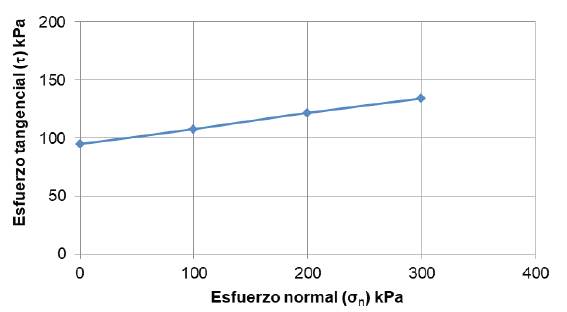 Como resultado del gráfico de la figura 4 se tiene que los parámetros de resistencia para el suelo de la formación Toledo son los que se presentan en la tabla 2. El ensayo se realizó con muestras de suelos saturadas por medio de la inundación de la caja de corte.