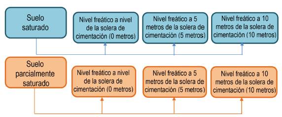 En la figura 5 se muestran los casos definidos en la modelación para las diferentes consideraciones del suelo parcialmente saturado, en el que se incluirá en cada uno de los modelos los resultados obtenidos mediante la curva característica del suelo.