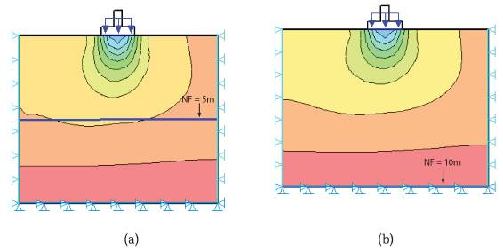 En la figura 8 aparecen los asentamientos producidos con la variación del nivel freático, considerando el nivel freático a 5 m y 10 m de profundidad respecto al nivel del suelo donde se encuentra apoyado el cimiento circular estudiado.