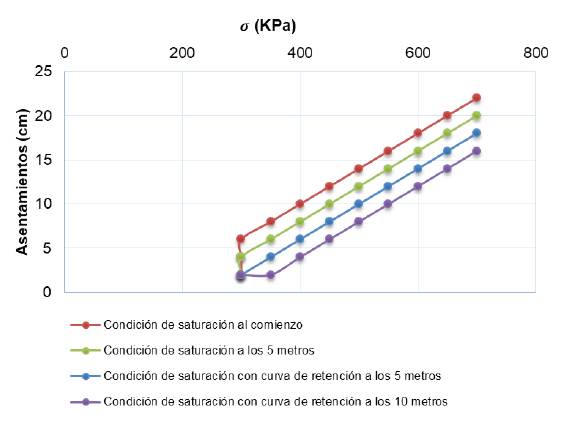 Asimismo, se aprecia que los asentamientos son mayores para la condición de saturación total del suelo y que disminuyen de manera progresiva en la saturación parcial a medida que el nivel freático se aleja de la base de la cimentación.